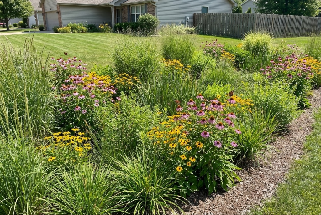 Rain garden plants get installed in zones matching water exposure. Center stays wettest longest needing species like swamp milkweed, cardinal flower, and soft rush tolerating standing water. Middle zones use Joe Pye weed, blue flag iris, and marsh blazing star handling periodic flooding. Outer edges stay drier suiting switch grass, prairie dropseed, and black-eyed Susans requiring good drainage. Plant spacing accounts for mature size and growth rates. We use a combination of container plants for immediate impact and plugs for cost-effective coverage. Our native planting methods ensure proper depth and spacing for rain garden conditions. Installation happens after soil work completes but before first major storm—established plants hold soil better than bare ground.