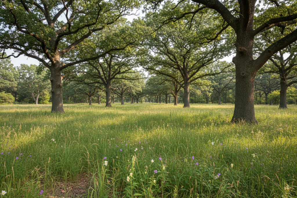 Nobody alive today has seen a real oak savanna. The last good ones disappeared before your grandparents were born. Most people see old oak trees standing in woods full of buckthorn and assume that’s what savannas look like. It’s not. Real oak savannas were open landscapes where mature oak trees stood 30 to 80 feet apart with full spreading canopies. Sunlight reached the ground beneath them. Native grasses and wildflowers grew in thick layers across the forest floor. You could walk through a healthy savanna and see 50 feet or more in any direction. When European settlers first documented Illinois, oak savannas covered millions of acres across the state. Fire swept through every few years and burned away woody brush before it could fill in the understory. Grazing by bison and elk removed seedlings before they could establish. Without fire and grazing, these open savannas closed in with trees within decades, and invasive plants eventually took over completely.